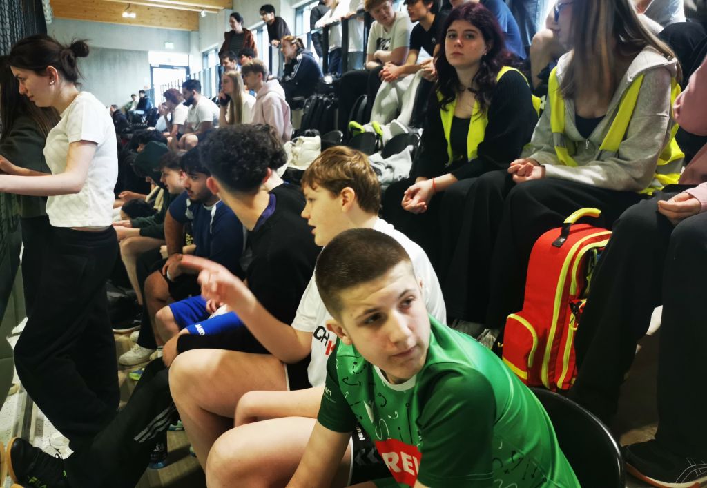 Während einige Klassen auf dem Spielfeld alles geben, verfolgen die anderen die spannenden Spiele von der Tribüne aus und feuern ihre Mitschülerinnen und Mitschüler begeistert an. Für die Sicherheit aller sorgten die Schulsanitäter, die für den Fall kleinerer Verletzungen bereitstanden. Die Sporthelferinnen und Sporthelfer sowie die Lehrkräfte achteten zudem auf einen fairen und reibungslosen Ablauf des Turniers.